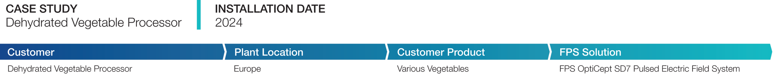 After in-depth product and process testing, FPS and OptiCept installed a SD7 pulsed electric field (PEF) system at the processor’s site in 2024. Designed with hygiene and efficiency in mind, the SD7 comfortably handled up to 15,000kg/hr of raw vegetables, delivering considerable improvements in energy usage, processing throughput and product quality. Placed after the wash step and before the slicers, the SD7 improved cutting, blanching, and drying.
